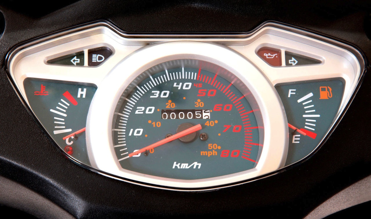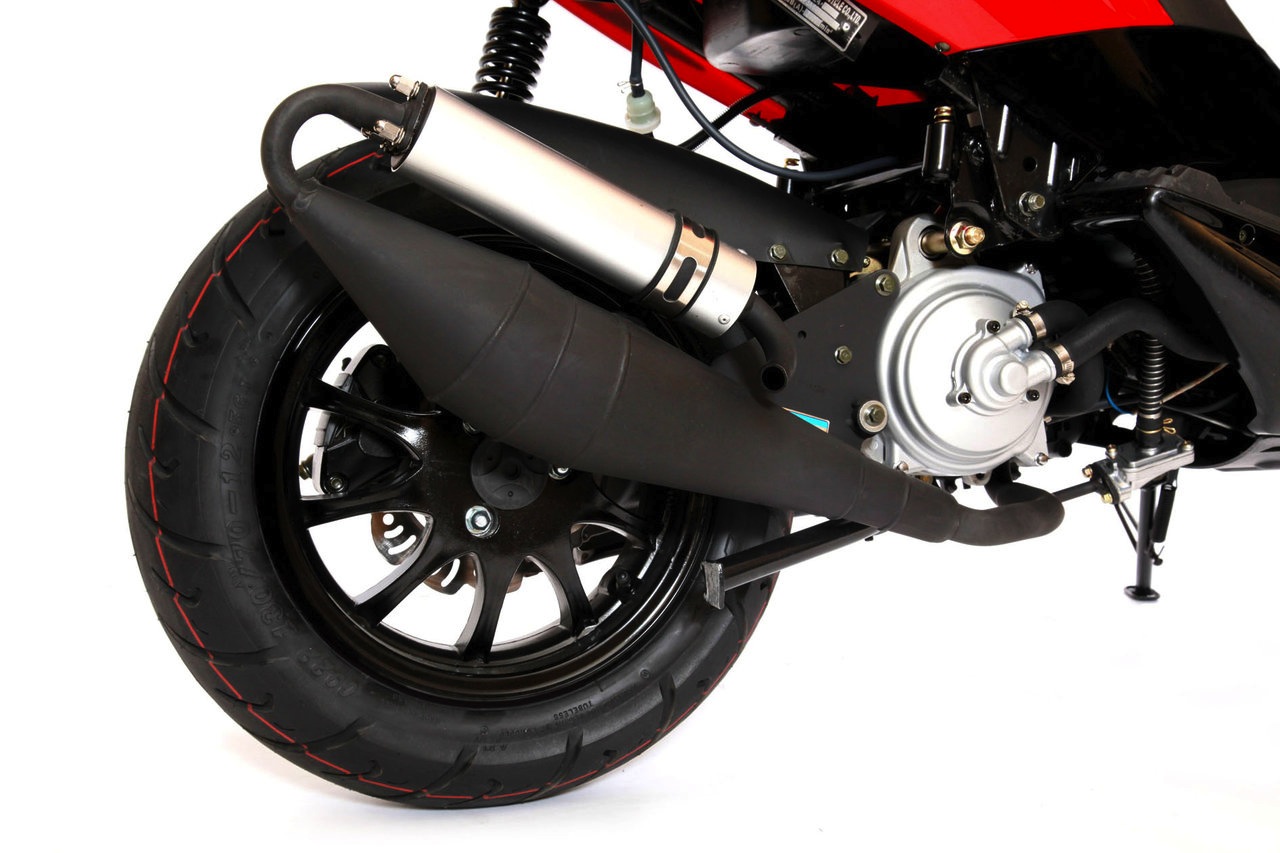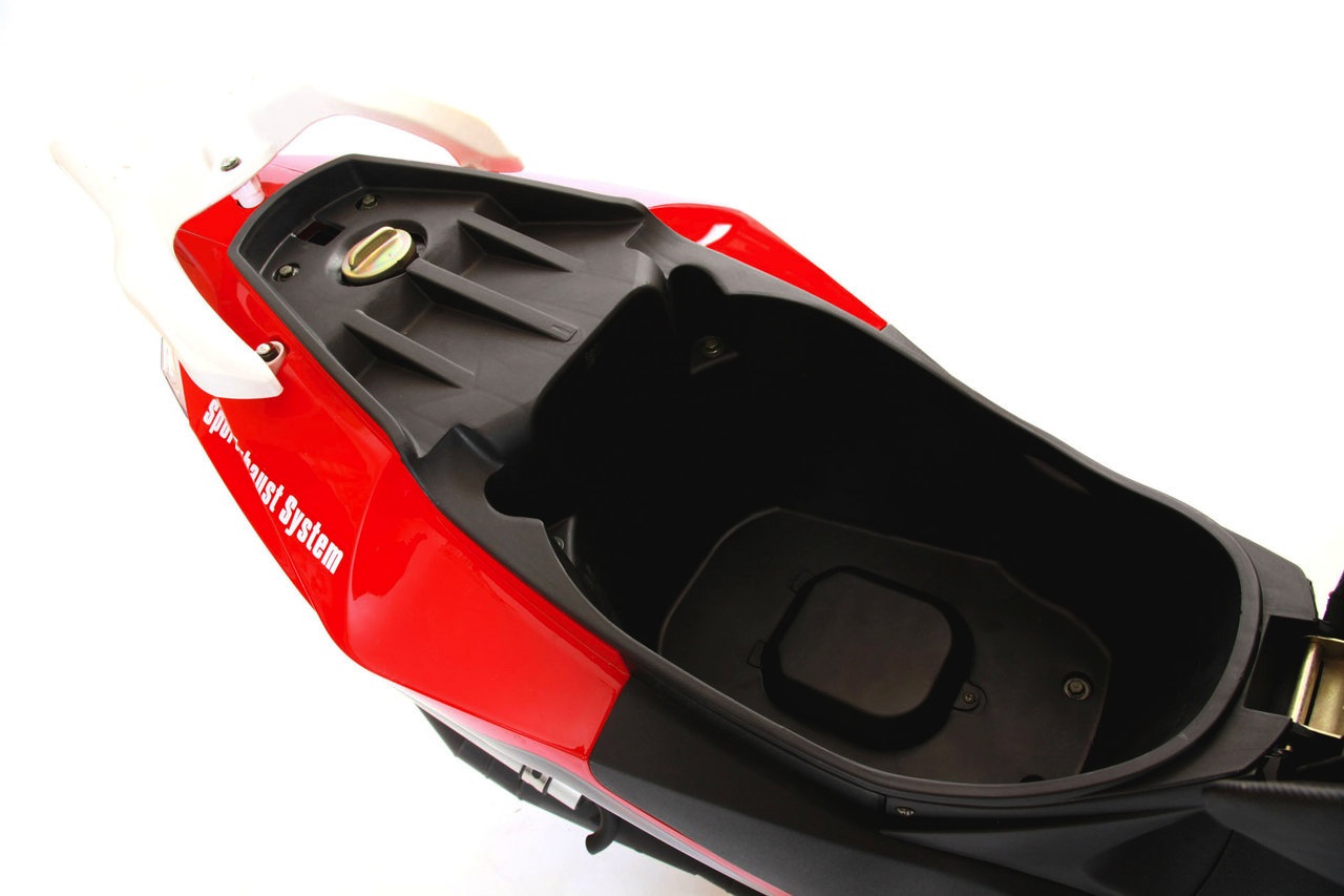 La scritta “H.D.B. Hydraulic Disk Brake” sul copriruota fa riferimento al freno a disco a margherita presente sia all’anteriore sia al posteriore. Frenata quindi potente, come l’accelerazione. Lo scarico ha l’espansione di colore nero e il silenziatore cromato. I due specchietti, sorretti da una doppia stanghetta di metallo profilata, seguono il look sportivo. Come i cerchi in lega, bombati e di colore nero, con pneumatico anteriore 120/70-12 e posteriore 130/70-12. Sella a doppia altezza con superficie “Hard Grip”, caratterizzata da un bel profilo rosso. Posto leggermente rialzato per l’eventuale passeggero, che può contare sul supporto delle due maniglie integrate nel portapacchi.
