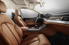 La A8 Audi exclusive concept si distingue per interni particolarmente eleganti, per i quali la Casa di Ingolstadt utilizza pelle anilina in colore Agata Cognac. Questa pelle pregiata è fornita dall’azienda italiana Poltrona Frau, che vanta una lunga tradizione nella manifattura dei pellami, e si caratterizza per la morbidezza e l’aspetto particolarmente naturale.