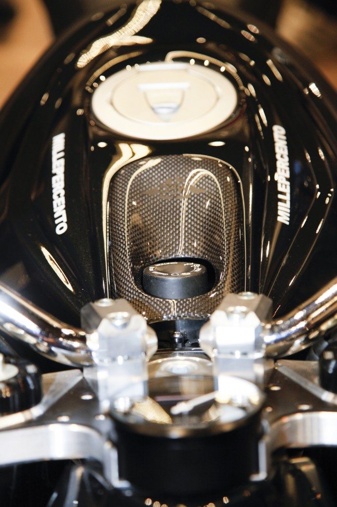 La strumentazione singola è incassata nella piastra superiore, il manubrio è diviso in 2 sezioni con un apposito spazio tra gli elementi. Attraverso questo accorgimento è possibile regolarne l’inclinazione e l’altezza. Il radiatore dell’olio è stato posto dietro al motore e presenta due prese d’aria per lato che convogliano il flusso. Tale posizione permette un efficiente sistema di raffreddamento e una maggiore pulizia delle linee in quanto l’elemento resta nascosto.