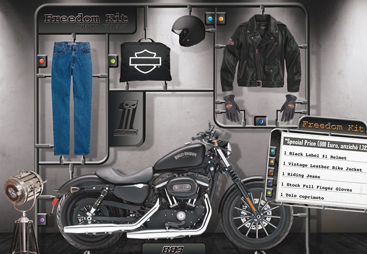 Giacca, guanti, casco, jeans e telo coprimoto Harley-Davidson sono offerti come “Freedom Kit” al prezzo speciale di 800,00 euro (anziché 1.323,00 Euro di listino ufficiale), esclusivamente a coloro che acquistano una nuova Sportster 883. Inoltre, scegliendo un finanziamento Harley/Own, si ha diritto a 1 anno gratuito di estensione garanzia .