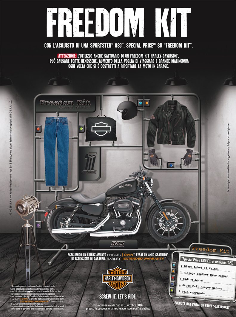 La filiale italiana della Casa di Milwaukee lancia una nuova iniziativa dal nome “Freedom Kit”. La formula è semplice: acquisti un nuovo modello Sportster883 (Iron 883, 883R o SuperLow) e accedi, ad un prezzo speciale, al Freedom Kit, che , in sintesi è un kit essenziale del perfetto biker: giacca, guanti, casco, jeans e telo coprimoto firmati Harley-Davidson.