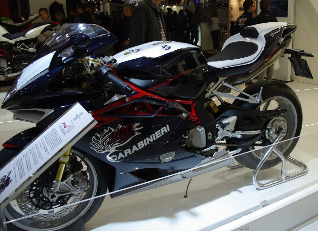 Torniamo a un nome italiano: MV Agusta. La band delle Brutale fa scintillare gli animi, ma a pretendere i flash questa volta è la nuova Rivale, una 800 dall’aria più leggera. Feeling di famiglia evidente, da pezzo d’autore, con il design molto elaborato. A mettersi in mostra anche un esemplare Rivale in dotazione alla Polizia, come un contraltare a fianco della F4 dei Carabinieri.