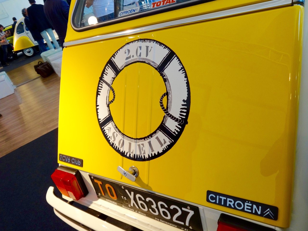ghi gialli, così come il cofano posteriore e la capote. I paraurti bianchi, come le scocche dei fari rotondi e i cerchi ruota, mentre sul bagagliaio c’è il disegno di un salvagente e sulle portiere un cappello da marinaio con pipa”. La 2CV Soleil sarà un esemplare unico, come unica è sempre un’opera d’arte.