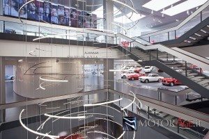 L’allestimento museale sottolinea i tratti “somatici” che appartengono al DNA Alfa Romeo, raffigurato mediante una suggestiva installazione luminosa che attraversa verticalmente l’edificio.