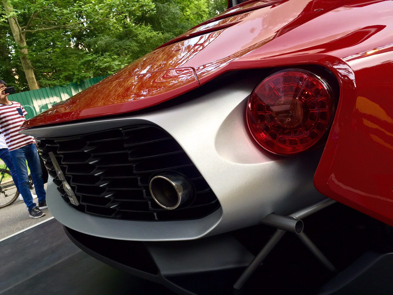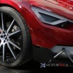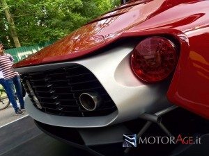 Osservando il frontale è chiaro che si tratta di una vettura nata per stupire: i gruppi ottici anteriori, con luci al led che si arrotondano all’altezza della ruota, l’apertura frontale per il radiatore che ricorda uno squalo pronto ad aggredire.