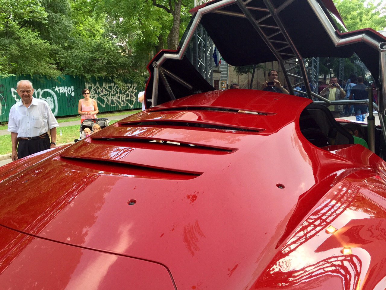 Il posteriore è imponente, la coda è alta e gli scarichi sono in posizione rialzata. L’accesso all’auto, decisamente scenografico, avviene mediante rotazione della capsula composta da parabrezza, tetto, finestrini e portiere.