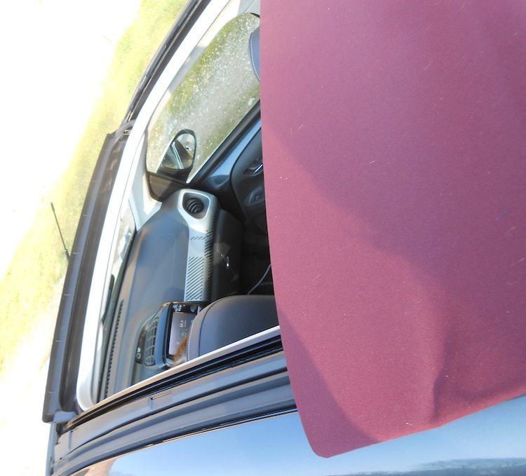 Poi, basta alzare la mano per trovare sulla plafoniera il comando elettrico del tetto in tela. Il movimento sembra un po’ “laborioso” ma avviene velocemente, per offrire un ampio spazio di apertura al cielo di 80 cm di larghezza e 76 di lunghezza. L’apertura ha più posizioni (dipende da quanto si pigia il tasto): sopra i posti anteriori, sopra i 4 posti, completamente. Un mini deflettore cerca di limitare la turbolenza d’aria nell’abitacolo, e fino a 60 all’ora ci riesce bene, poi dipende da voi.