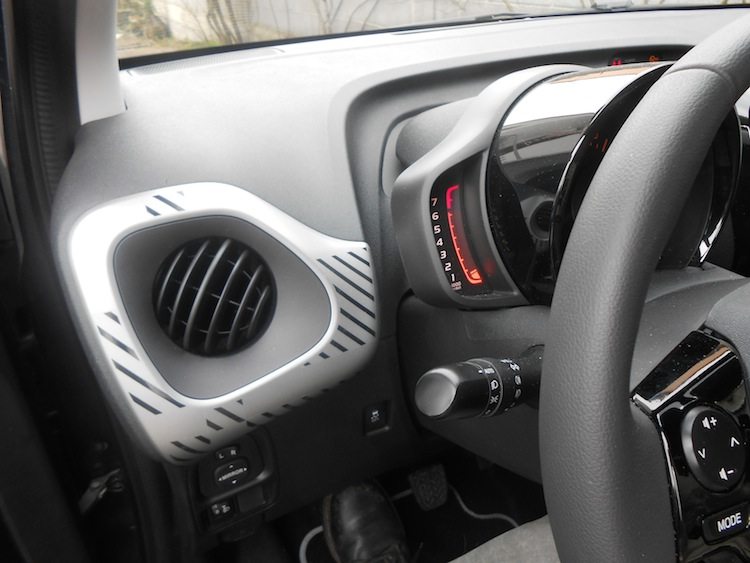 Di fronte a sé, il guidatore ha un blocco strumenti compattato e avanzato, solidale al piantone dello sterzo, regolabile in altezza. C’è un solo strumento circolare, racchiuso da una palpebra; comprende il tachimetro analogico e un display LCD rotondo con il livello carburante e informazioni di viaggio, come il consumo instantaneo e medio. Ai lati incorpora strette sezioni digitali verticali: a sinistra il contagiri e a destra l’indicatore di cambio rapporto (Gear Shift Indicator) con relativo “consigliometro”. Un’impostazione semplice, funzionale e caratterizzante sul fronte stilistico.