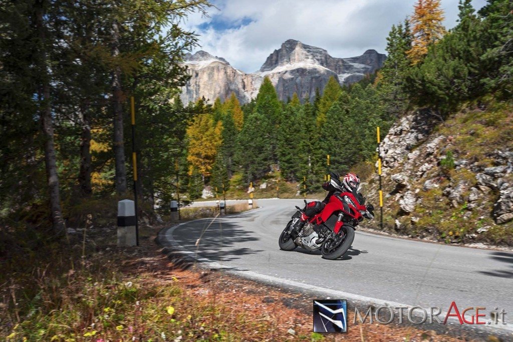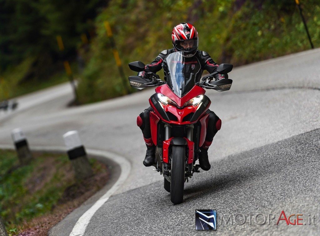 Salendo a bordo abbiamo apprezzato immediatamente la posizione di guida nettamente più confortevole che non in passato, anche più comoda per due. Le pedane sono rivestite con un inserto in gomma in modo da isolare le gambe dalle vibrazioni, che può essere rimosso per avere una pedana dentata di ispirazione off-road che garantisce più grip. La sella è regolabile in altezza tra 0,825 e 0,845 e il manubrio a sezione variabile ottimizza il comfort di guida e la posizione dominante di chi sta in sella, salvaguardando l’ampio angolo di sterzo. Sotto la sella del passeggero è presente un vano porta-oggetti molto capiente. Due prese di corrente da 12 V sono posizionate una immediatamente sotto la sella passeggero e l’altra nella zona anteriore, mentre un modulo Bluetooth, tramite il sistema “Ducati Multimedia System” consente di connettere la moto con uno smartphone e di gestire le funzioni multimediali.