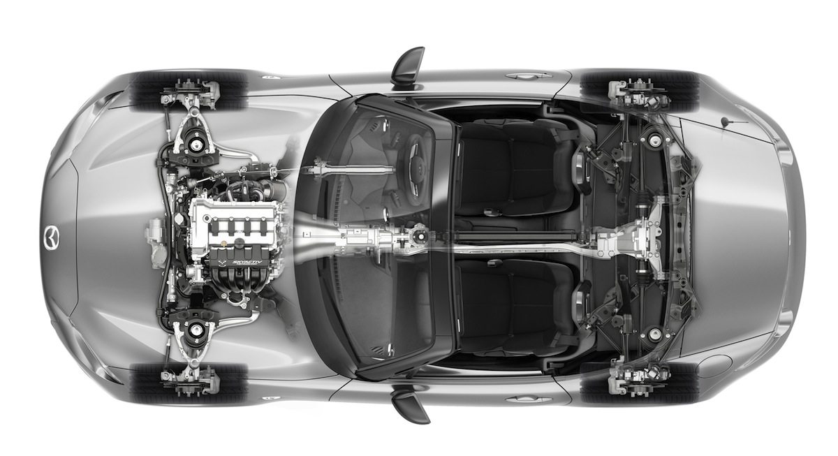 L’impostazione con motore anteriore centrale e trazione posteriore ha una bella carica di dinamismo. La cura dimagrante l’alleggerisce di circa 100 kg rispetto al modello precedente, con la ripartizione dei pesi bilanciata 50:50 tra i due assali ma col baricentro ulteriormente abbassato, a enfatizzare la proverbiale agilità che dà la sensazione di guida tipo go-kart. Giusto per seguire il concetto di divertimento Jinba Ittai (“cavallo e cavaliere come una cosa sola”) questa è la MX-5 più leggera e con il più basso centro di gravità di sempre.