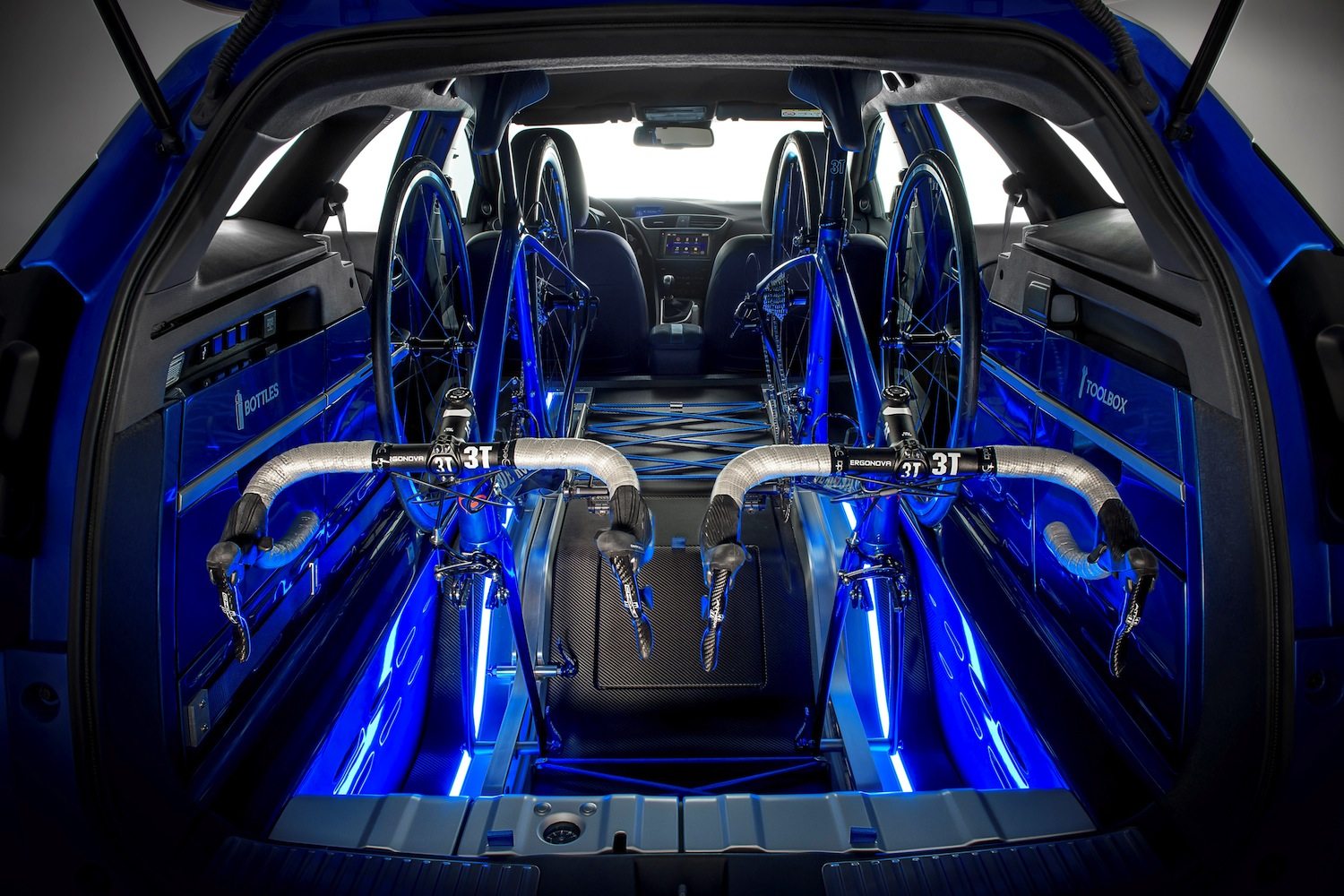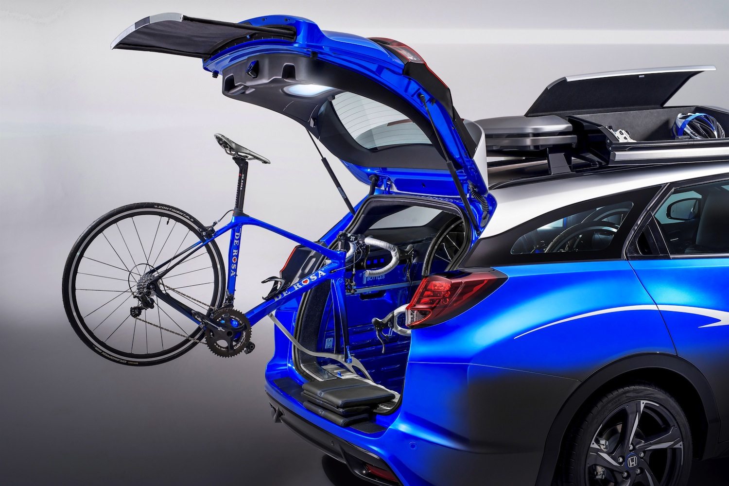 Per esempio, nel rivestimento laterale del portabagagli sono ricavati una cassetta porta utensili, un portabottiglie, un vano per una tanica e una ruota anteriore. Da annotare il box aerodinamico per il tetto, a custodia di svariati oggetti, ma ancora Honda mette in risalto quelli per il ciclista, come scarpe e caschi.