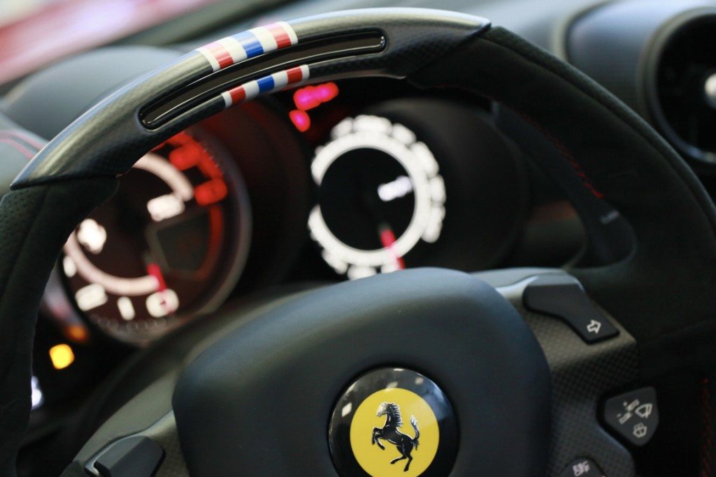 Anche gli interni appaiono nettamente ispirati alla vettura da corsa. Dunque Alcantara a piene mani, insieme a un tessuto nero opaco che richiama la fibra di carbonio e caratterizza anche il volante, proprio come sulla 458 GT3. Inoltre, la pedaliera della California T è in alluminio nero, mentre la tappezzeria (compresi i tappetini) è in un tessuto tecnico nero denominato SuperFabric. Si tratta di un materiale rigido, a prova di proiettile, con finiture 3D sulla superficie. Anche i sedili in Alcantara sono caratterizzati da inserti in tessuto ad elevato grip per il massimo comfort di guida.