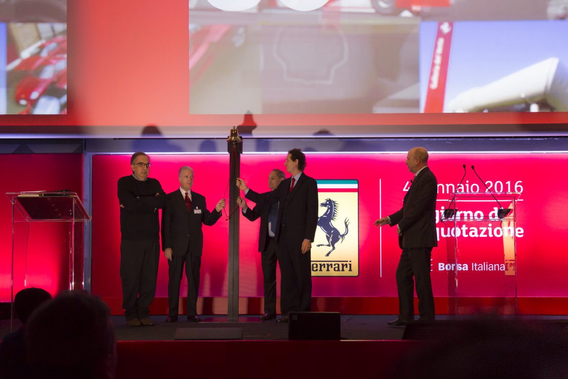 Le contrattazioni del titolo con il ticker RACE sono state inaugurate dalla tradizionale campanella, suonata dal Presidente della Ferrari Marchionne, dal Presidente di FCA John Elkann, dall’Amministratore Delegato di Ferrari Amedeo Felisa e dal Vicepresidente Piero Ferrari. Dal canto suo Marchionne ha sottolineato quanto questo ingresso sul mercato italiano rappresenti un punto di partenza più che di arrivo, ricordando inoltre la scissione appena avvenuta da FCA. Separazione che sancisce formalmente l’indipendenza che il Marchio ha sempre avuto all’interno del gruppo. Sempre Marchionne ha ribadito l’importanza dell’italianità del Cavallino Rampante, ringraziando John Elkann e Piero Ferrari, eredi degli uomini che nel 1969 strinsero un patto di alleanza basato innanzitutto sul rispetto reciproco: Giovanni Agnelli ed Enzo Ferrari. Inoltre, ci sono state parole di gratitudine per la città di Milano, rappresentata in sala dal vicesindaco Francesca Balzani, dove Enzo Ferrari mosse i suoi primi passi da pilota al volante dell’Alfa Romeo.