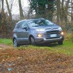 Nel corso delle prove, EcoSport abbiamo voluto portarla anche lontano dall’asfalto. E diciamo che gli sterrati li differisce bene, sia per l’assetto sia per i vantaggi degli sbalzi corti e degli angoli di attacco e uscita. L’escursione delle ruote non è però il suo forte. Con 16 cm di gradino siamo riusciti a staccare una ruota (posteriore) dal suolo. Il pianale alto non ha comunque avuto problemi e la trazione (anteriore) si è ripresa subito. Anche sui sentieri della boscaglia la manovrabilità è andata a suo vantaggio. Se ci fosse 4×4, la rigidità della scocca permetterebbe di osare quanto una Panda Cross.