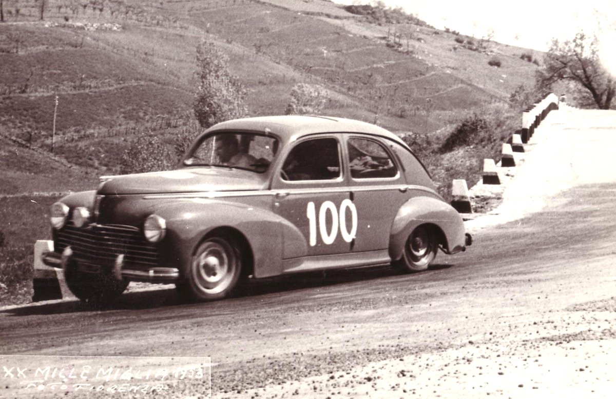 Alla Mille Miglia del 1953 la Peugeot 203 condotta da Gino Munaron, in coppia con Lucio Finucci, fu prima della sottoclasse fino a 1.300 cc, mentre l’anno seguente un esemplare gemello guidato da Paul Giraud e Pierre Allanet si aggiudicò il 64esimo posto assoluto. Quest’ultimo fu considerato un risultato eccellente, tenuto conto della cilindrata della vettura e dell’elevato numero degli iscritti. Iscritti che al via a Brescia erano 378, mentre al traguardo (sempre nella “leonessa d’Italia”) furono solamente 182. Tornando a oggi, la Peugeot di Donghi affronterà in quattro giorni il tragitto Brescia-Roma-Brescia, che le 203 di Munaron-Finucci e Giraud-Allanet coprirono in un solo giorno. In sostanza le tappe della Mille Miglia storica sono quattro e più precisamente: Brescia-Rimini, Rimini-Roma, Roma-Parma e Parma-Brescia con una prova cronometrata all’Autodromo di Monza.