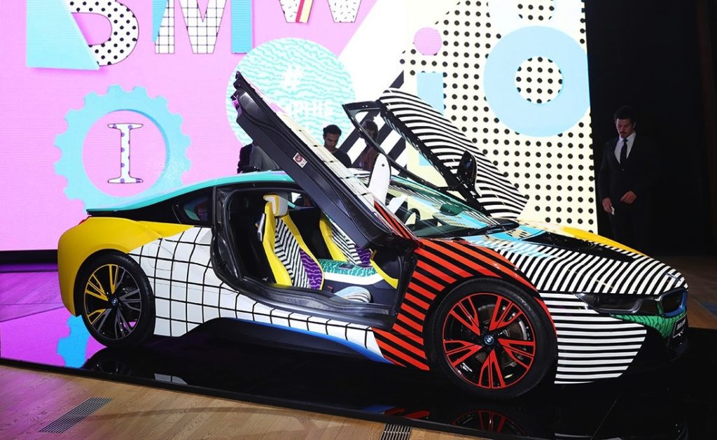 Osservando da vicino le due one-off emerge come i dettagli colorati e irriverenti tipici del design Memphis siano figure geometriche ripetute. Sulle BMW i3 e i8 Memphis Style sono state applicate diverse mascherature prima delle differenti fasi di verniciatura per ricreare i singoli pattern. Sono ben otto gli strati di colore applicati, un numero che testimonia inequivocabilmente la notevole complessità dell’intero processo.