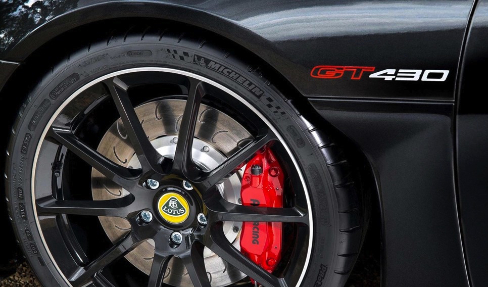 Rispetto alle altre Evora, la GT430 si distingue anche a livello estetico. Infatti, spiccano l’inedito alettone posteriore che dagli studi in galleria del vento ed al simulatore permette di ottenere una deportanza di 250 kg a 305 km/h. Si fanno notare anche le prese d’aria maggiorate e i parafanghi posteriori allargati che accolgono ruote da 20”. Queste ultime calzano pneumatici Michelin Pilot Sport Cup dalle misure 245/35R19 anteriormente e 295/30R20 posteriormente.