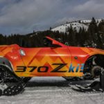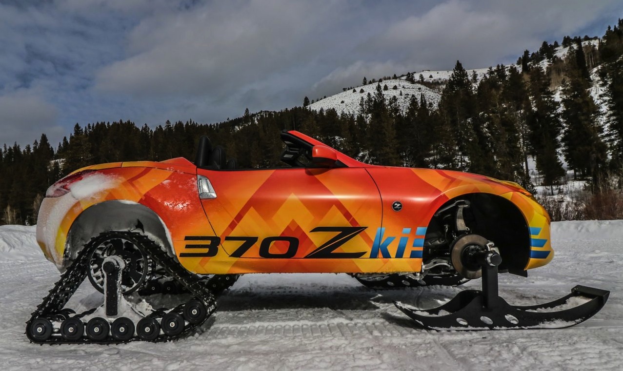 Rinnovando la recente tradizione di presentare Concept di veicoli invernali al Salone dell’Automobile di Chicago La Nissan ha trasformato la 370Z Roadster di fabbrica in una motoslitta.Non è stato facile fare spazio ai cingoli posteriori DOMINATOR di American Track Truck, Inc., rivedere gli attacchi delle molle delle sospensioni anteriori, adeguarle al nuovo assetto rialzato e montare i cingoli sui mozzi delle ruote per le quali sono stati prodotti appositi distanziali da 7,5 cm.
