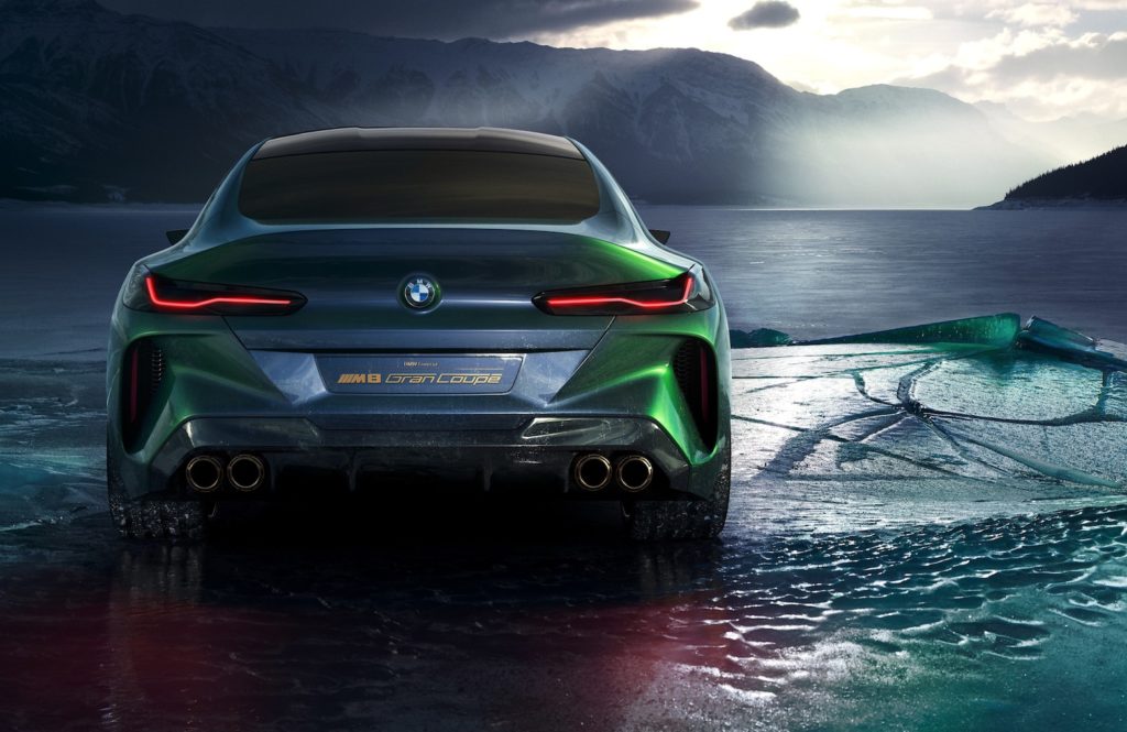 La forma dei gruppi ottici anteriore è in pratica la stessa che abbiamo visto sul prototipo Serie 8 Coupé, mentre il paraurti ha ampie aperture in perfetto stile BMW M. Altro segno di appartenenza alle BMW ad alte performance è la presenza dei quattro terminali di scarico. Anche se non c’è nulla di ufficiale, questa scelta lascia intendere la presenza di un bel motore a scoppio. Una vera e propria notizia in un proliferare, anche al Salone di Ginevra, di motorizzazioni esclusivamente elettriche. Come dire che per una BMW M “con la spina nel fianco” occorrerà attendere ancora. Infine, posteriormente, oltre ai quattro finali di scarico vi è un terzo volume assai compatto e l’alettone ricavato direttamente nel portellone.