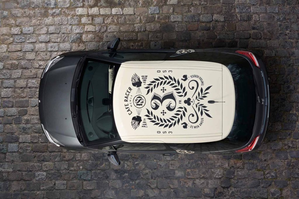 Il principale elemento di personalizzazione è costituito dal tetto. Infatti quest’ultimo, sfoggia la tinta créme Parthénon squisitamente classica, su cui è stata applicata a mano un’opera che richiama sia il brand DS che il movimento Café Racer. Inoltre, l’attenzione scrupolosa al dettaglio è evidenziata dai badge specifici applicati sul cofano e sulle portiere. Non mancano distintive decorazioni sul portellone posteriore e sulla classica “pinna di squalo”.