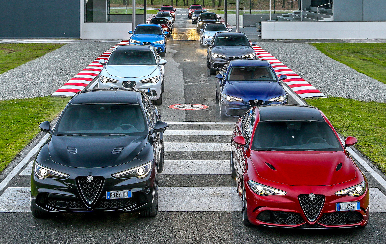 Balocco. Qui si sperimentano dagli Anni 60 tutte le Alfa Romeo e oggi siamo presenti in questo tempio dell’alta velocità, riservato anche agli altri marchi del Gruppo FCA, sotto una pioggia battente. Neanche a farlo apposta la condizione climatica ideale per verificare le soluzioni tecniche di Stelvio e Giulia, apprezzando ancora una volta la loro straordinaria dinamica di guida.