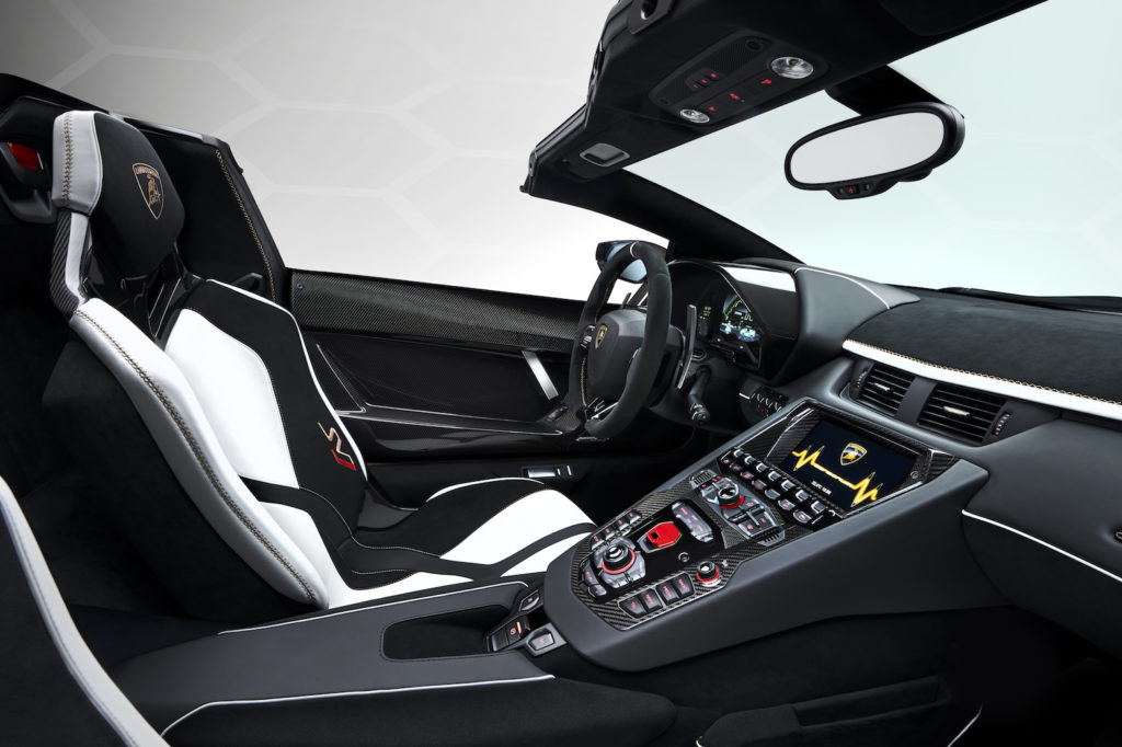 Sull’Avantador SVJ Roadster non c’è la classica capote in tela, perché molto probabilmente verrebbe divelta al primo accenno di velocità seria. Al suo posto, infatti, c’è un robusto ma leggero tetto in fibra di carbonio con tecnologia ad alta pressione RTM.