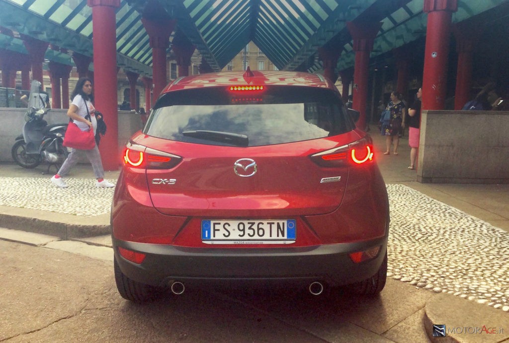 La linea di cintura alta della carrozzeria che si fa un po’ onda rende il profilo bello dinamico, lasciando però a lunotto e coda un ruolo importante nel design. Del resto la parte posteriore, con la complicità dell’ottica a Led, pare importante nella distinzione della CX-3.