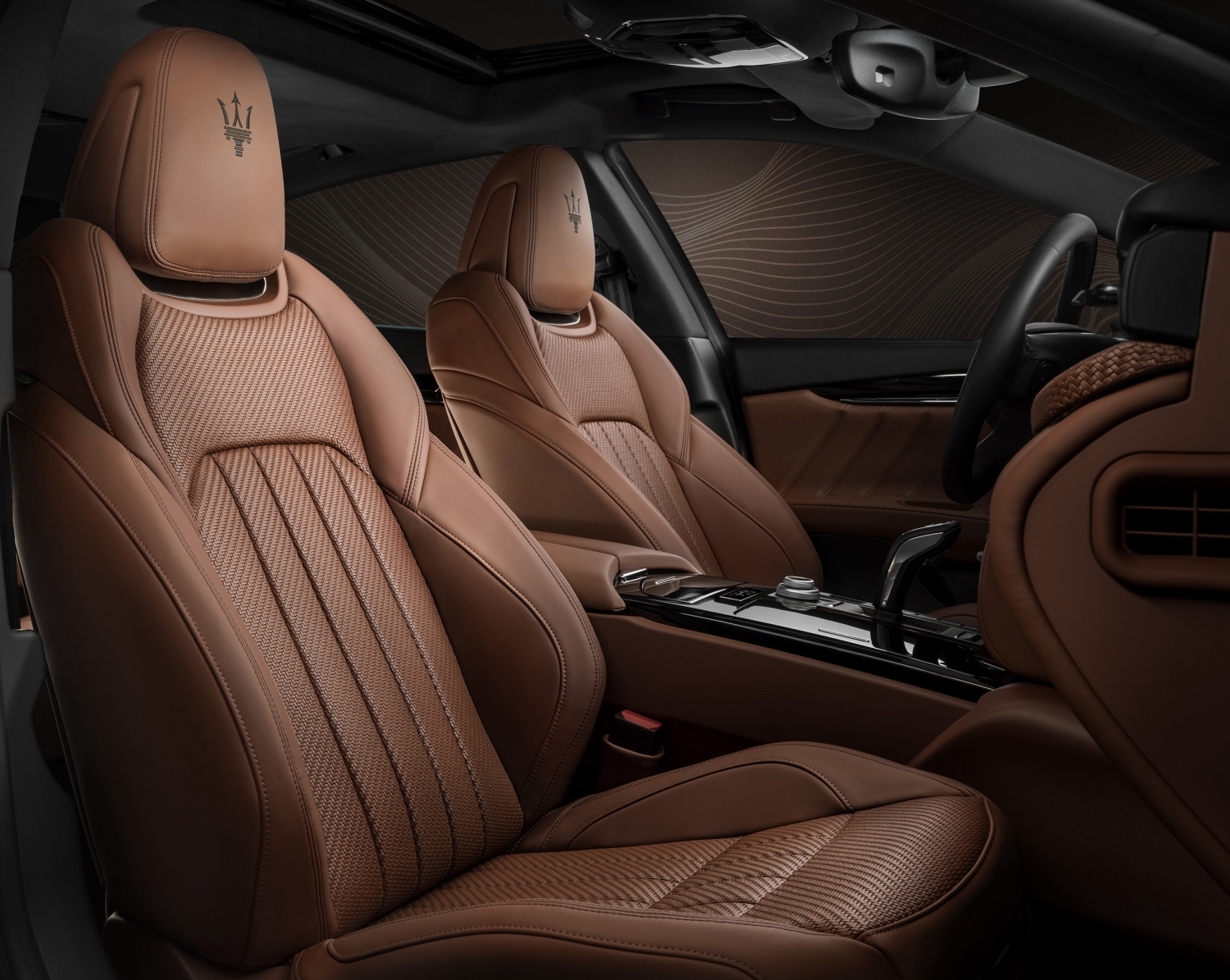 Gli interni della Maserati Royale, basati sull’allestimento GranLusso, hanno rivestimenti firmati Ermegildo Zegna. Realizzata appositamente per la Maserati l’inedita Pelletessuta, è disponibile in color Cuoio o in pelle Pieno Fiore bicolore Nero/Cuoio. Il nuovo materiale, leggero e resistente, è realizzato tramite sottili strisce di pelle Nappa intrecciata in modo che sembri un tessuto.