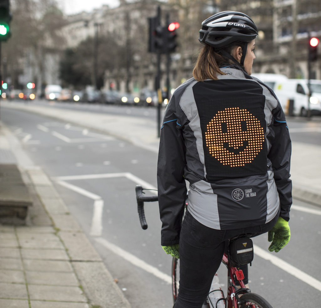 Chi indossa il giubbino, mettiamo il caso di un ciclista, attiva ciascun emoji utilizzando un telecomando wireless, che nell’occasione è montato sul manubrio della bicicletta. Quindi, mani che rimangono al posto giusto e, secondo le intenzioni, comunicabilità diretta, piacevole e facilmente comprensibile visto che utilizza già che oggi è diventato un linguaggio universale.