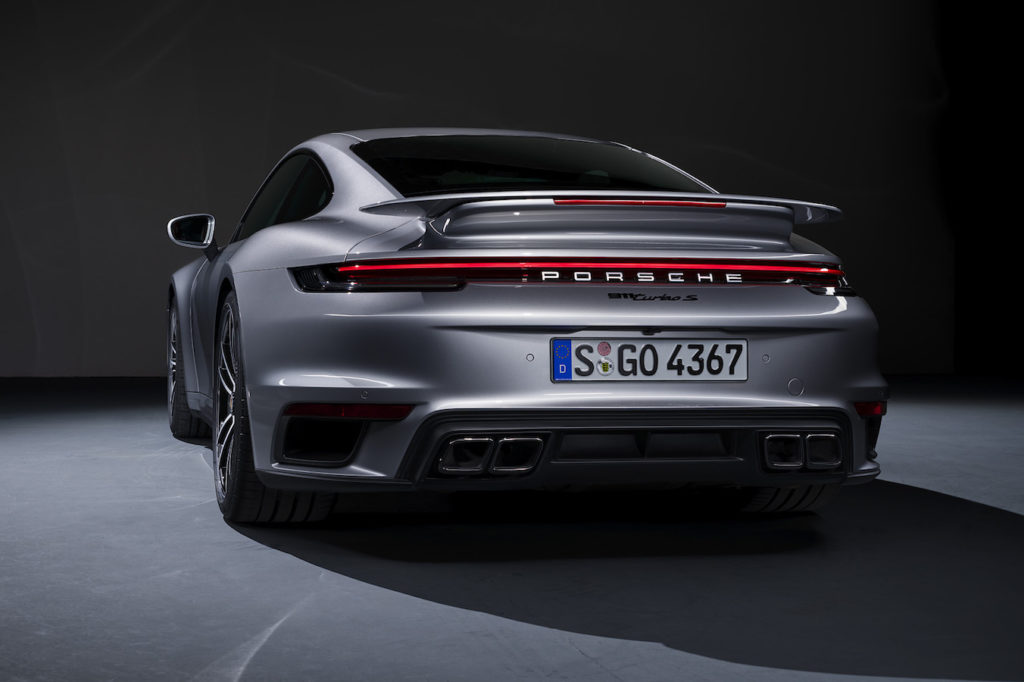 Per quanto riguarda l’estetica, la nuova sezione con prese d’aria maggiorate ha un aspetto tipicamente da 911 Turbo, caratterizzato da doppi moduli di luce frontali e fari a LED, con tecnologia Matrix di serie e inserti scuri. Grazie allo spoiler frontale ridisegnato ed estensibile pneumaticamente e all’alettone maggiorato, il carico aerodinamico risulta aumentato del 15%. Il nuovo look della sezione posteriore è completato da terminali di scarico rettangolari con finitura di colore nero lucido, come è tipico della Turbo.